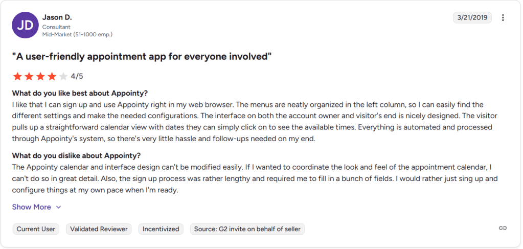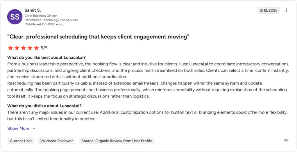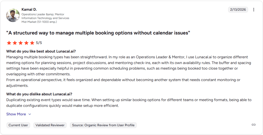 Email and text reminders are one of Calendly’s stronger day-to-day wins. Another G2 review said the reminders and calendar connection were helpful. I agree, especially for reducing no-shows and cutting follow-up calls from the front desk. I’m placing that screenshot below because it matches the real value here.