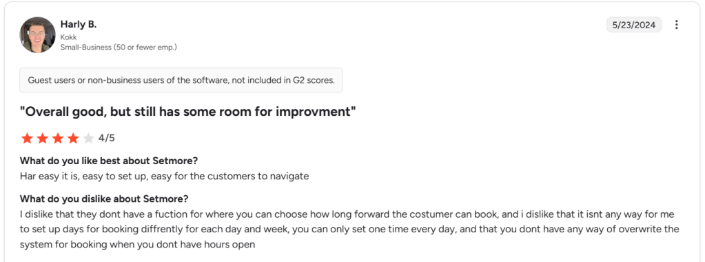 I mostly agree with the 2024 G2 review that said Setmore is easy to set up and easy for customers to navigate, and I’ve shared that screenshot below too. That part felt true. Where I only partly agree is availability depth: once you start thinking through uneven grooming days, late drop-offs, or blocked windows, the rules feel thinner than what some pet-care teams will want.