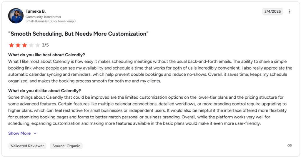 - For shops that need different intake flows for puppy grooms, matted-coat work, and anxious-pet bookings, Calendly starts to strain because lower tiers feel tight and users on Capterra specifically mention trouble tailoring intake questions across event types.