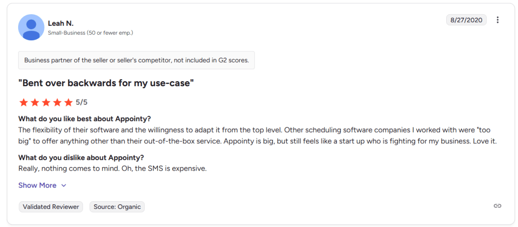 One G2 reviewer said Appointy bent over backwards for a unique use case. I partly agree. I would not treat it as deeply custom software out of the box, but I do think it looks more adaptable than many large scheduling tools that force you into a fixed flow. However, they did consider the SMS prices to be quite expensive, so I’m sharing that screenshot below. One extra nuance I liked: a Capterra review from a dog training business praised the easy onboarding and price, which is a useful pet-adjacent signal most roundups miss.