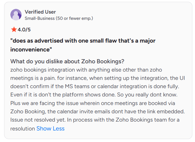 - Integration outside the Zoho ecosystem can feel limiting. Many users report friction when connecting external tools, especially compared to more open platforms.