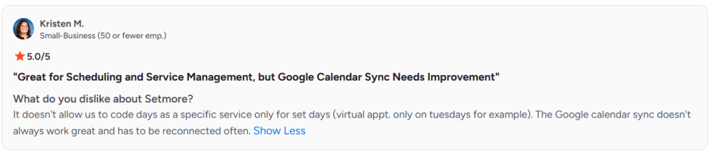- Service-specific scheduling can feel restrictive. For example, setting different services on specific days is limited, as highlighted in Setmore G2 reviews. This becomes a blocker for clinics or structured service businesses.